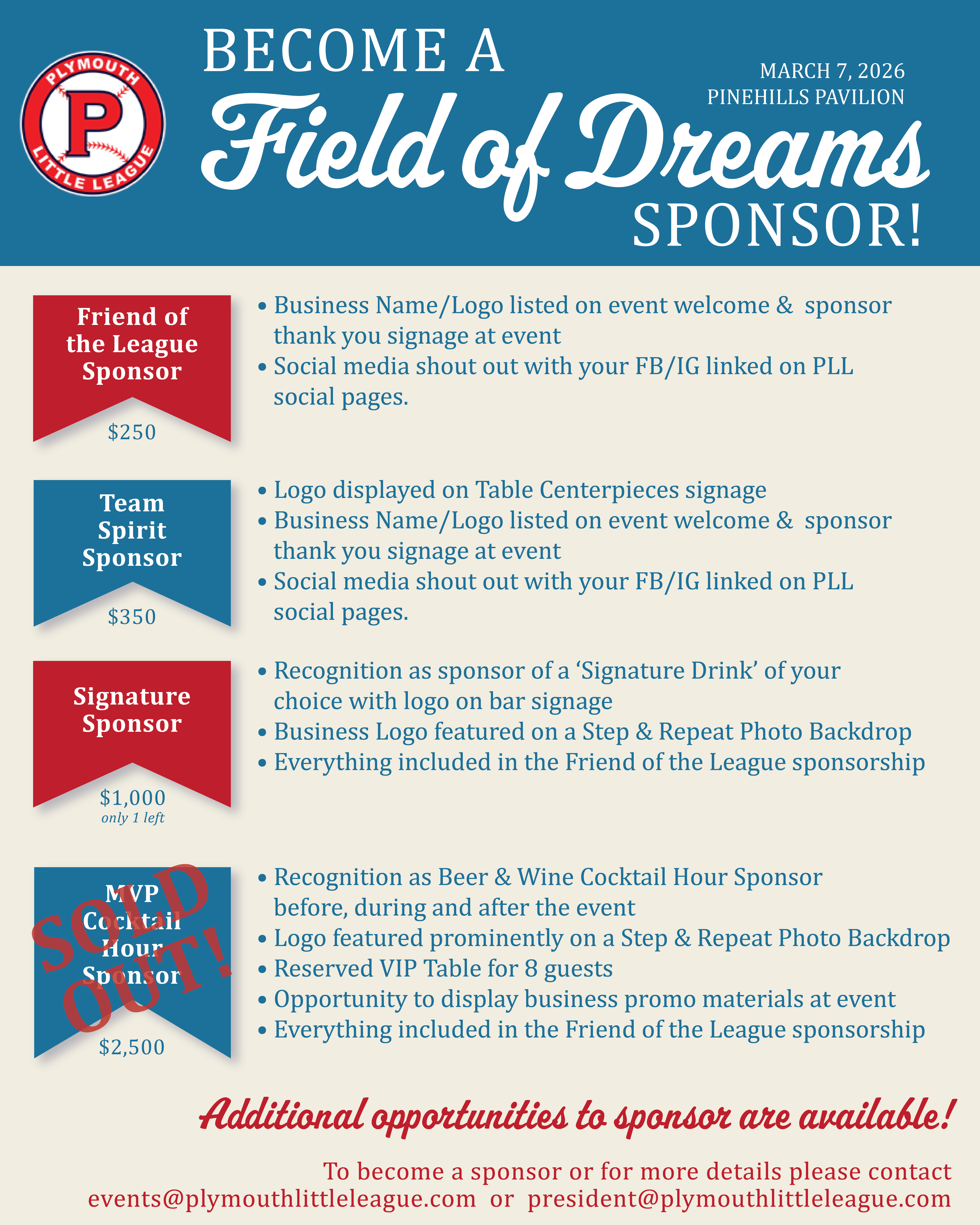 Grab your friends and family and join us for a night of music and dancing while raising money to support the future of Plymouth Little League.